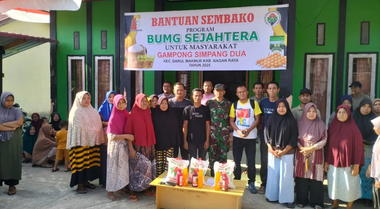 Bantuan itu diserahkan oleh pak khecik didampingi oleh Babinkantibmas, pengurus BUMG dan pendamping desa, sebanyak 140 paket sembako,di halaman depan Gedung desa simpang dua, kecamatan darul makmur, Nagan Raya, Rabu (26/3/2025).