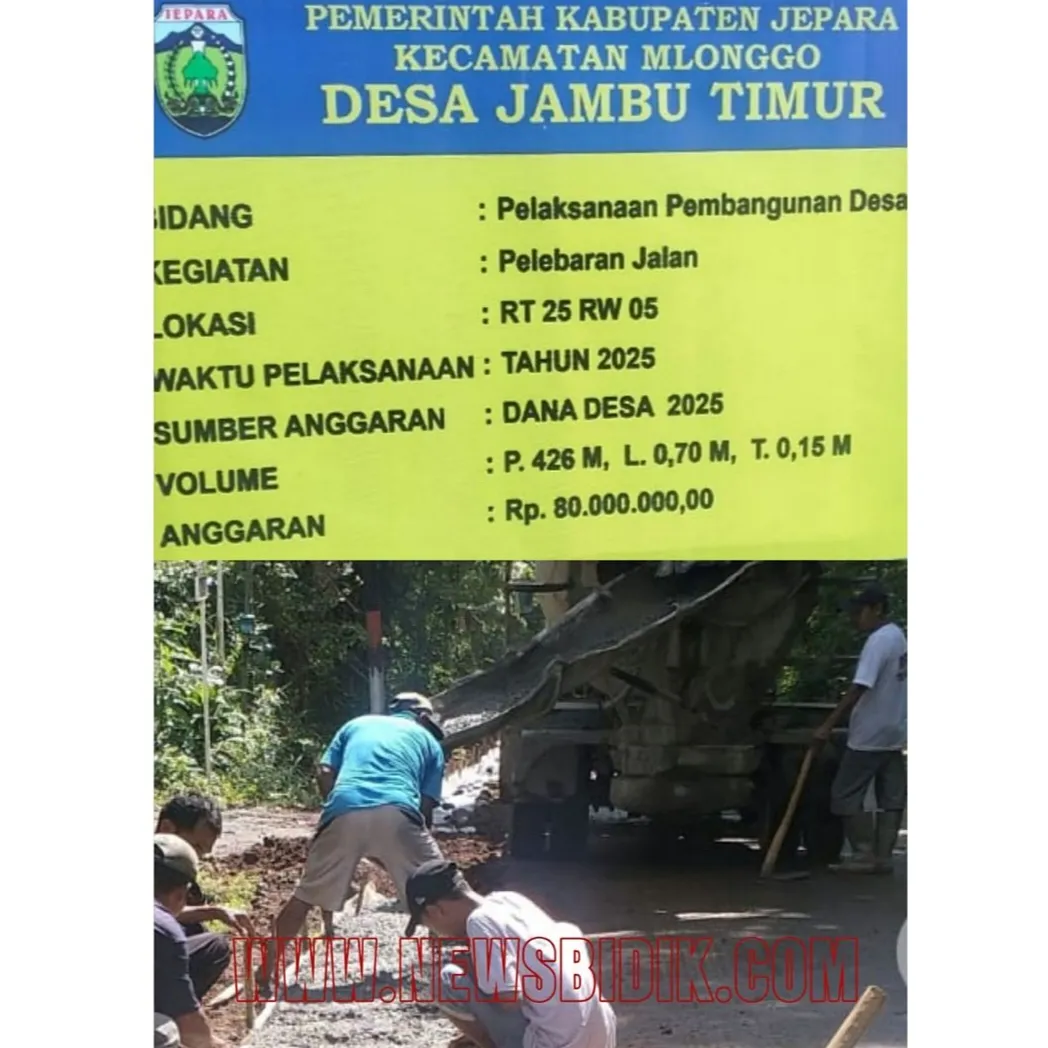 NEWS-BIDIK,//Jepara — Pemerintah Desa Jambu Timur, Kecamatan Mlonggo, Kabupaten Jepara, diduga melanggar Undang-Undang Nomor 14 Tahun 2008 tentang Keterbukaan Informasi Publik (UU KIP) dalam pelaksanaan proyek fisik pelebaran jalan di RT 25 RW 05. Proyek yang bersumber dari dana desa tahun anggaran 2025 dengan nilai Rp 80 juta itu terlihat dikerjakan langsung oleh Kepala Desa setempat bersama beberapa pekerja, Senin (30/6/2025).