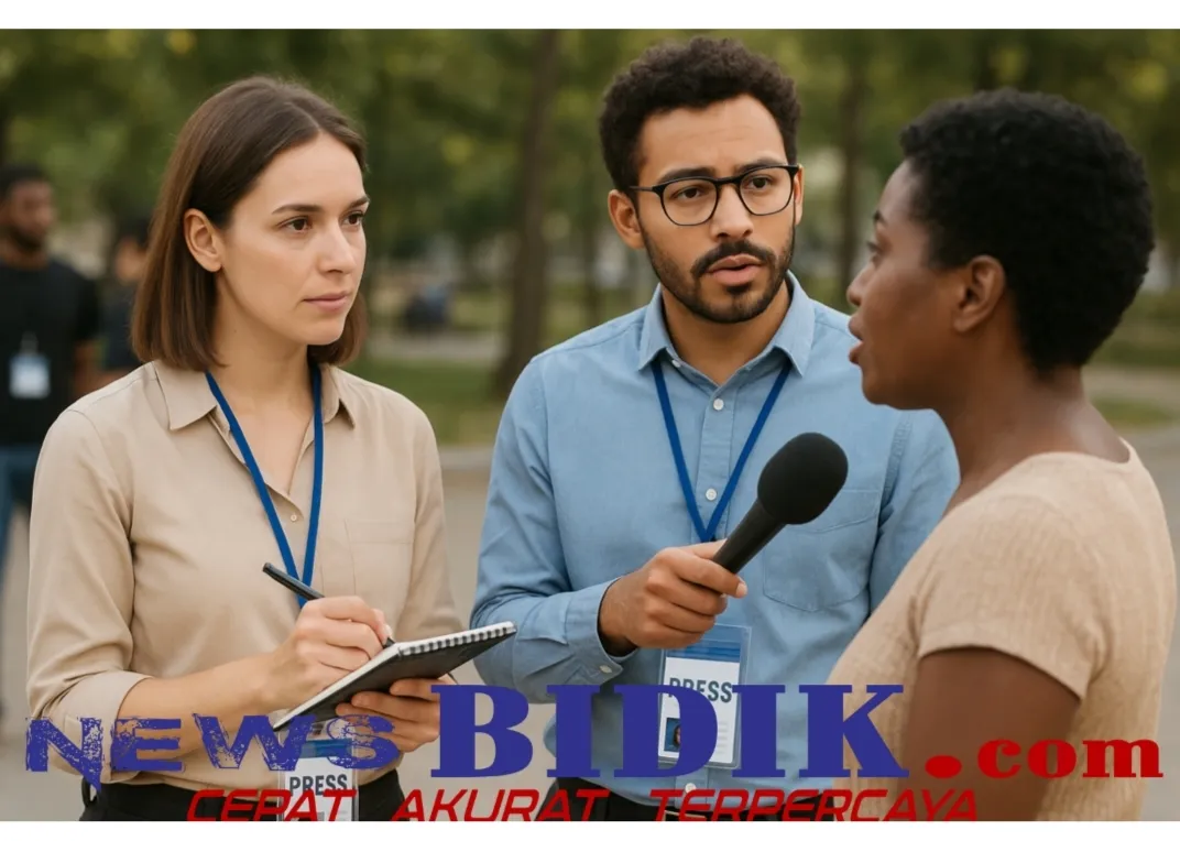 Dua jurnalis—pria dan wanita—lengkap dengan ID card pers sedang melakukan wawancara kepada warga dalam peliputan lapangan. Gambar ilustrasi ini menggambarkan semangat jurnalisme yang hidup dan aktif di tengah masyarakat.Minggu,(17/8/25). dok. newsbidik.com / red / Zahari Z