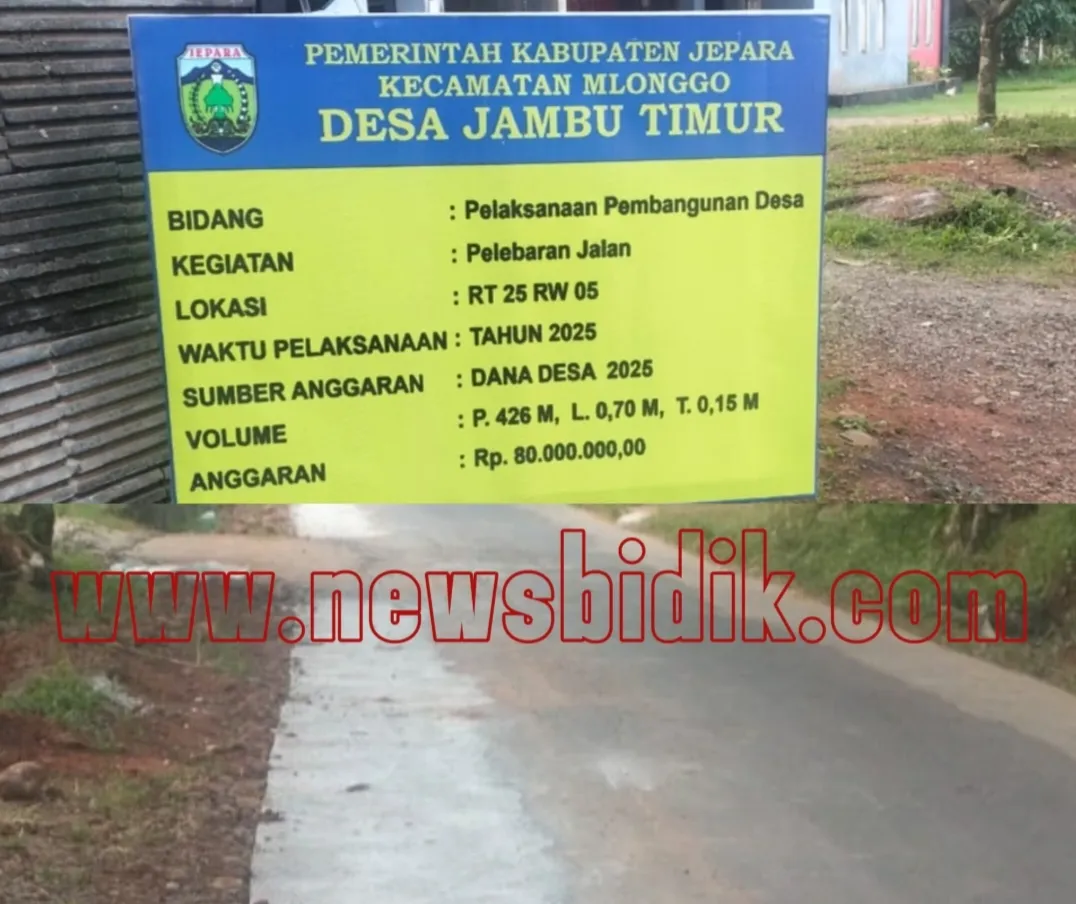 NEWS-BIDIK,//Jepara — Proyek pelebaran jalan di Desa Jambu Timur, Kecamatan Mlonggo, Kabupaten Jepara, yang bersumber dari Dana Desa tahun 2025, menuai sorotan publik. Pekerjaan senilai Rp80 juta tersebut diduga sarat praktik penyelewengan oleh pihak pemerintah desa.